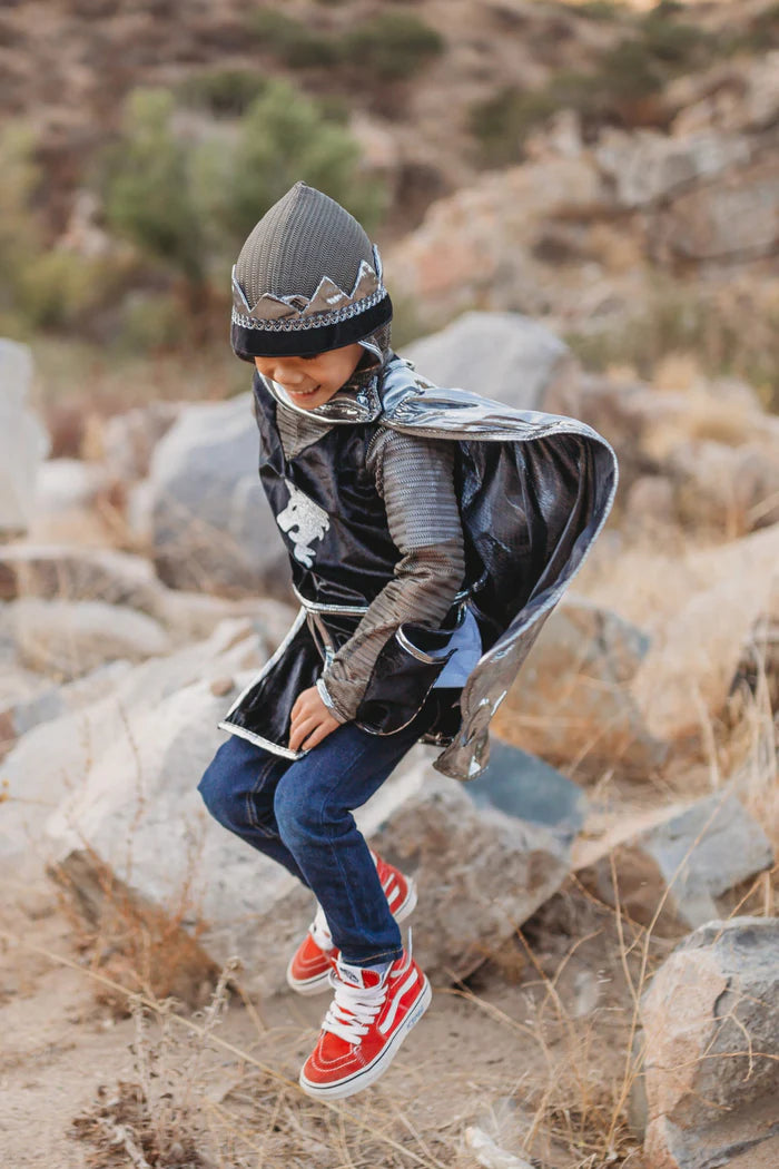 Prêt à combattre avec cet incroyable ensemble de chevalier à capuche argenté 3 pièces. Cet ensemble comprend une tunique à capuche, une cape de chevalier et une couronne argentée. Un emblème de lion scintillant embellit l'avant de la tunique en velours noir avec un tissu en cote de maille sur les manches longues. Et la couronne de chevalier assortie avec détails argenté!