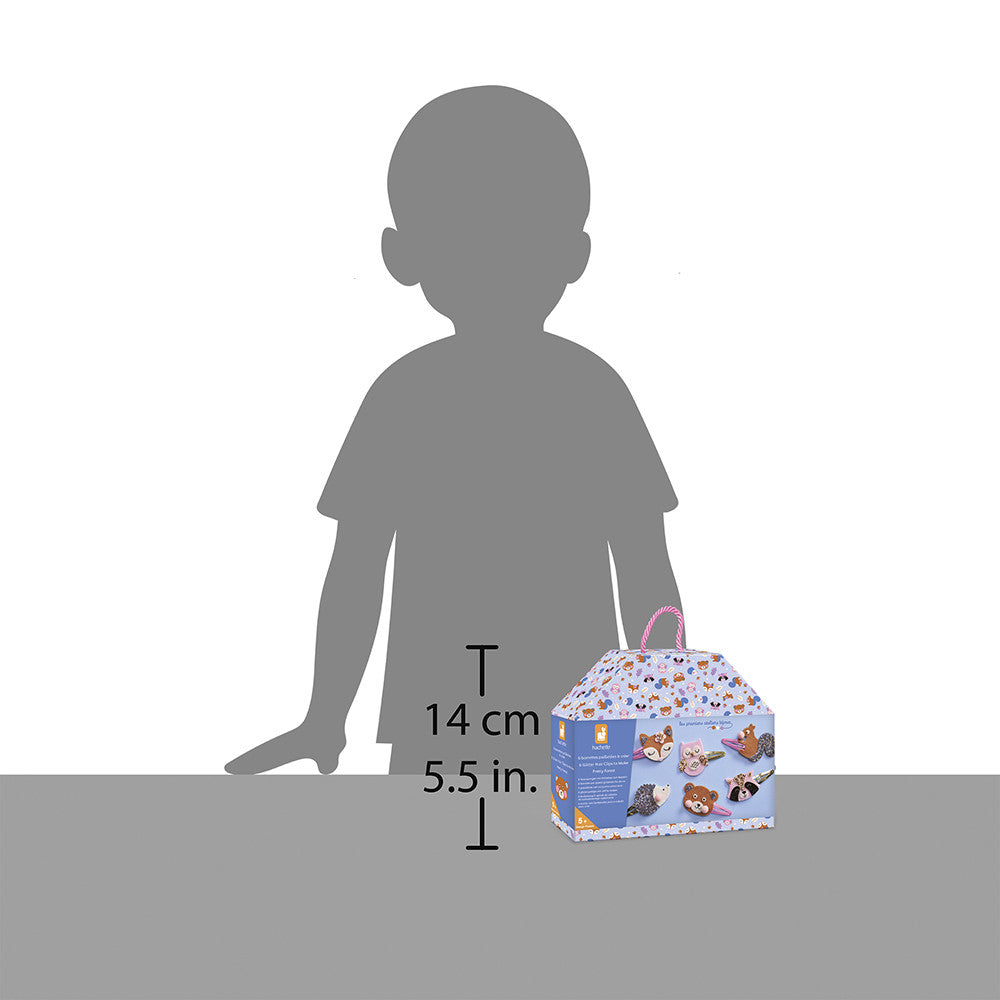 Ajoute une touche automnale à ta coiffure avec ce kit créatif permettant de créer 6 barrettes à paillettes sur le thème des animaux de la forêt ! Adorables, mais aussi funs et étincelants : tout ce qu'aiment les enfants à partir de 5 ans. Ce set propose aux petits artistes de réaliser et de porter ensuite leurs créations ! Il suffit d'un peu de patience et de minutie pour réaliser ses propres accessoires, et porter fièrement : une renarde, une chouette, un hérisson, un ours, un raton-laveur, et un écureuil. Ce coffret contient : 6 barrettes de 5 cm, 3 planches de feutrine prédécoupée et autocollante, 2 planches de matière pailletée prédécoupée et autocollante, 4 pompons, des pastilles autocollantes double-face. Pas besoin de colle ! Un livret est aussi inclus, avec toutes les instructions et les modèles à reproduire avec le contenu du kit. Au total, il faudra compter 10 minutes pour réaliser une barrette, soit environ 1 heure pour créer les 6. Grâce à leur concentration et leur dextérité, les fans de bijoux et d'accessoires seront ravis de créer eux-mêmes leurs petits trésors. Voilà un loisir créatif ludique qui satisfera les amateurs de DIY ! Son plus ? La boîte imprimée et assortie qui prend la forme d’un petit sac à transporter partout ! Ce kit créatif Barrettes Pretty Forest à créer est issu de la collection les Ateliers Bijoux.