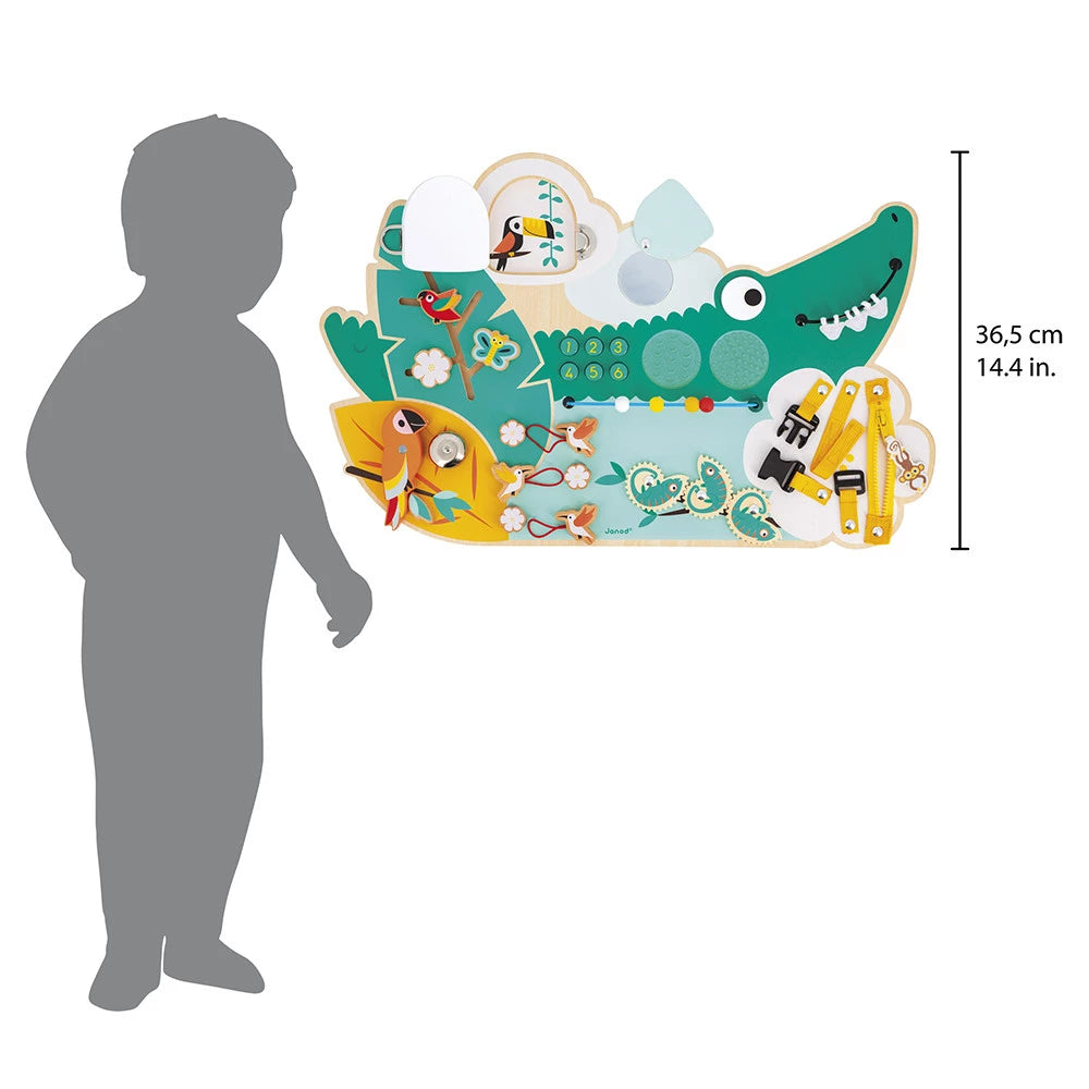 Un busy-board tout droit sortie de la jungle pour la chambre de bébé ! Idéale pour divertir et stimuler les petits, dès 18 mois, cette planche d’activités en forme de crocodile propose une multitude de jeux à manipuler. Au total, plus de 14 jeux d’éveil sont répartis sur ce panneau d’activités, pour favoriser le développement de la motricité et de la dextérité des enfants. Au programme des réjouissances : 1 labyrinthe avec 3 éléments à manipuler, 1 œil rotatif sonore, 3 sangles avec différents systèmes de fermeture (fermeture éclair, scratch, plastique), 3 engrenages caméléons, 1 sonnette, 1 serrure métallique, 1 miroir caché, 1 boulier avec des billes colorées, des textures en silicone et en feutrine à toucher, des boutons à pousser, des élastiques à attacher … Vous l’aurez compris, ce sont des heures de découvertes qui s’offrent aux petits curieux ! Que de plaisirs tactiles et sonores au service de la motricité fine de bébé. Et des ouvertures diverses et accessibles, pratiques pour s’entrainer à s’habiller. C’est un jouet d’éveil polyvalent, complet et parfait pour des moments de jeu autonomes. Vous pouvez facilement fixer le busyboard en bois au mur. Il saura trouver sa place dans une chambre d’enfant, grâce à son style tropical et ses couleurs vives. Bébé retrouvera tous les animaux stars de la jungle : toucan, perroquets, singe … Et le crocodile, bien sûr ! Dimensions : 57 x 36,5 cm. Issu de notre collection de jouets d’éveil en bois Tropik, ce busy-board crocodile est composée de bois certifié FSC™. Croco n’attend plus que vous !