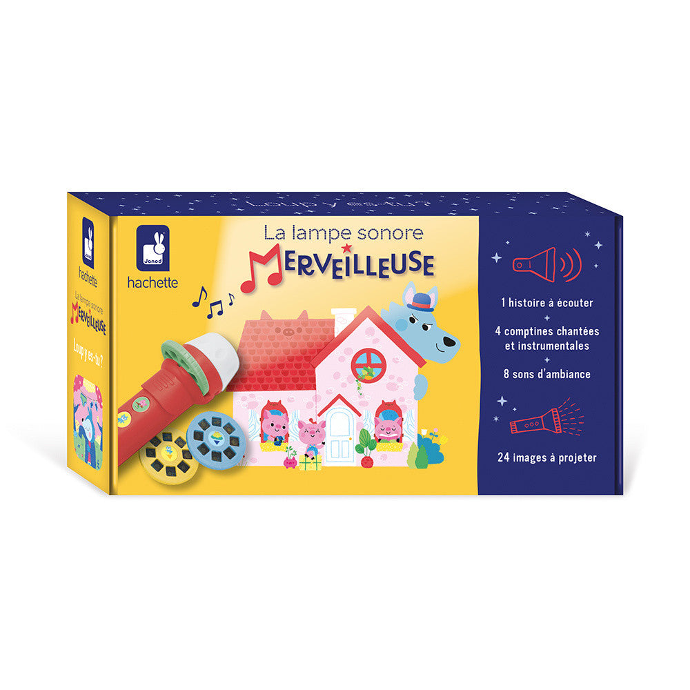 Qui a peur du grand méchant loup ? Avec la Lampe Sonore Merveilleuse « Loup, y es-tu ? », les enfants à partir de 3 ans profitent de récits amusants dans l’univers des contes avec leur propre lampe à histoires. Téméraire, parfois lourdaud mais toujours rigolo, notre ami le loup vit sans cesse de drôles de péripéties dans les histoires des petits ! Invitez votre bambin dans un univers magique et donnez vie aux récits avec cette conteuse d’histoires ludique ! Cette jolie lampe est bien plus qu'une simple lampe de poche pour enfant. En effet, elle combine un projecteur d'images et une conteuse sonore, créant ainsi une expérience immersive pour les tout-petits. 9 minutes de son sont disponibles au total : l’incontournable histoire des « Trois petits cochons » d’une durée de 4,6 minutes, 4 comptines accompagnées de leurs versions instrumentales d’une durée de 2,7 minutes (« Promenons-nous dans les bois », « Le loup, le renard et la belette », « Le loup a des poux », « Le grand loup du bois ») et 8 sons thématiques immersifs de 95 secondes. Du son mystérieux du vent dans les arbres aux bruits de pas dans les feuilles, votre enfant s'évade alors dans une forêt où se déroulent de folles d’aventures. Notre lampe à histoires est livrée avec 3 rondelles correspondant chacune aux 3 boutons de la lampe et contenant 8 images, ainsi qu’un pochon de rangement. Pratique et nomade, cette lampe se glisse aisément dans un sac à dos pour divertir les enfants même dans les transports. Son utilisation intuitive permet aux petits de prendre le contrôle en toute autonomie. Préparez-vous à des moments magiques et amusants au moment du coucher ou pendant un temps calme, que ce soit en utilisant la lampe de manière autonome ou en l’utilisant vous-même pour conter les histoires à votre enfant. Les trois boutons, chacun associé à une rondelle d'images, permettent à votre enfant de choisir l'univers qui l'accompagnera dans le monde des contes. Alimentée par 2 piles AAA (non incluses), notre lampe sonore merveilleuse est prête à éclairer les rêves de votre tout-petit. Son design malin ne s'arrête pas là ! La lampe est livrée avec un pochon de rangement en coton : pas besoin de chercher sous les draps ou dans tous les recoins au moment de l’histoire du soir, la Lampe Sonore Merveilleuse de Janod trouve rapidement sa place dans la chambre de votre enfant. Offrez-lui une nuit remplie de féerie et d'aventures avec la Lampe Sonore Merveilleuse – Loup y es-tu ?, conçue en collaboration avec la maison d’édition Hachette. Lampe sonore, lampe à projection et conteuse d'histoires : l’imagination de votre enfant est décuplée !