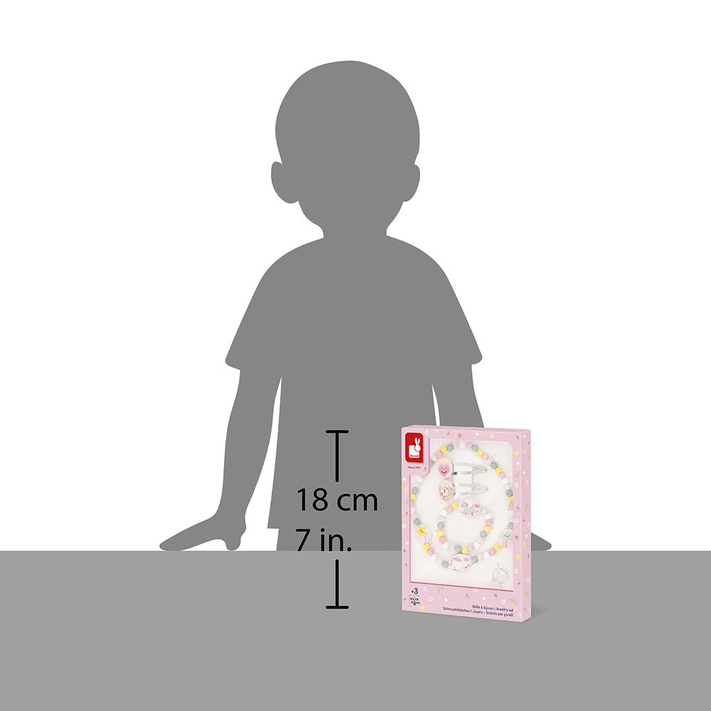 Ajoutez une touche de fantaisie aux tenues des enfants ! Ce set de bijoux licornes convient aux petits à partir de 3 ans. Il se compose d’un collier, d’un bracelet, d’une bague et de deux barrettes, le tout sur le thème fabuleux des licornes ! Soit 5 bijoux en bois pour arborer une jolie parure assortie à sa coiffure. Idéal pour les fans de bijoux ou de tout ce qui est magique, cet assortiment de bijoux permet aux enfants d’exprimer leur personnalité. Ils font comme les grands et portent leurs propres bijoux, pour affirmer leur style et leurs goûts ! Les jolies couleurs et les illustrations pleines de poésie sont à croquer : licornes, arcs-en-ciel, étoiles, cœurs … Pour un look plein de charme, qui donne confiance en soi ! Ce set de 5 bijoux licornes est composé de bois issu de forêts gérées durablement, certifié FSC™. Chez Janod, les licornes sont astucieuses et usent de magie pour garder leurs secrets. Impétueuses et iconiques, elles évoluent dans un univers poétique, aux couleurs intemporelles. Alors, affichez votre style !