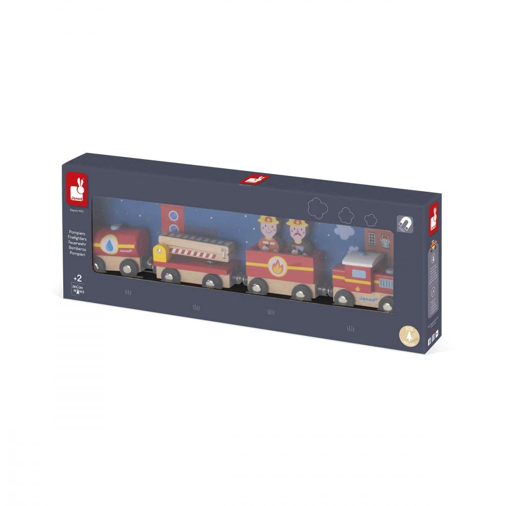 Avec ce train en bois magnétique votre enfant va voyager dans l'univers des pompiers et combattre le feu avec eux. Ce train de pompiers en bois est composé de 4 wagons magnétiques et de 2 pompiers. L'un des wagons est composé d'une échelle rotative et télescopique.