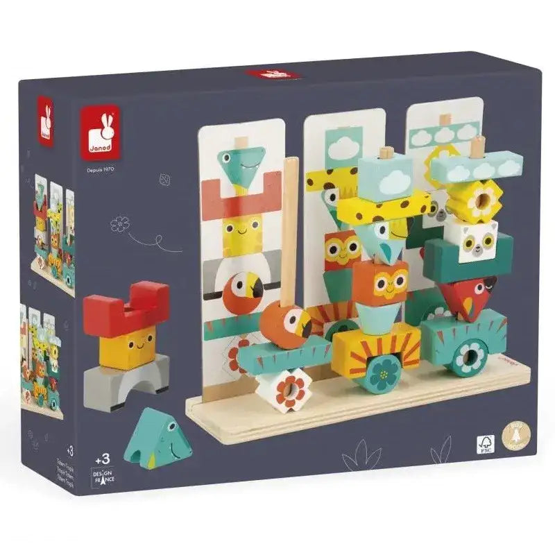 Janod - 52 pièces en bois à empiler sur 3 tiges pour réaliser 12 modèles de totem. Dextérité et observation sont de mise ! Dès 3 ans, ils reproduisent les modèles fournis ou imaginent leurs figures. Age minimum : 3 an