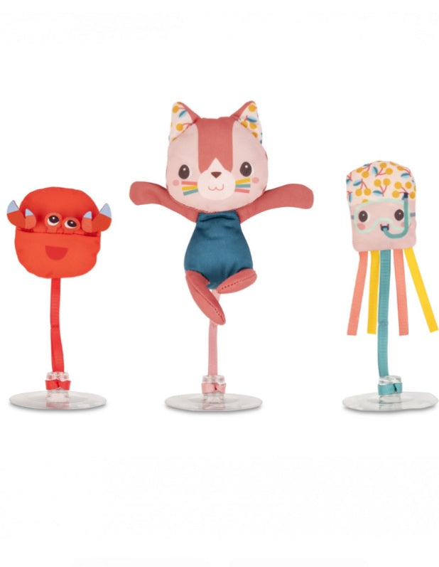 Jeanne le chat et ses amis adorent prendre le bain avec bébé ! Ce jouet de bain se compose de 3 personnages avec ventouses, pratiques et originaux. Ils sont idéals pour les tout-petits dès 3 mois et même pour les enfants plus grands. Ils mesurent 8 x 7,5 x 7 cm. Fini les jouets qui s'éloignent de votre enfant au gré des vagues dans la baignoire ! Grâce à leurs ventouses, Jeanne le chat et ses copains le crabe et la méduse seront toujours à portée de main de bébé. Fixez-les sur la paroi ou au fond de la baignoire, et regardez-les danser sur l'eau ! C'est parfait pour développer la vue et la motricité des plus petits. Colorés, avec leurs différentes expressions, ces jeux de bain peuvent aussi être utilisés dans la douche. Jeanne préfère faire la planche et s’amuse à sortir les pattes de l’eau, tandis que la méduse fait tournoyer ses tentacules colorés et que le petit crabe montre ses pinces. Composées de polyester, ces 3 jouets de bain sèchent rapidement, ce qui est vraiment pratique et hygiénique ! Nous vous conseillons de faire sécher les personnages après chaque utilisation et de les laver en machine à 30° au besoin. Laissez bébé explorer à son rythme au moment de se laver, et votre rituel du soir n'en sera que plus sympathique. Avec son premier jouet de bain Lilliputiens, bébé prend plaisir à éclabousser ! C'est idéal lorsque vous souhaitez le rafraichir en s'amusant dans l'eau par une chaude journée. 1, 2, 3 ... Au bain les petits chats !