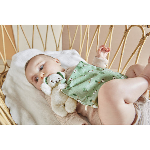 Le meilleur ami de bébé ! Ce doudou chien est adapté dès la naissance et sera le compagnon de tous les instants de votre enfant. Composé de 95% de matières et rembourrage recyclés (polyester), c'est un doudou vert aussi moelleux que réconfortant. Le petit chien est doux comme un nuage, il est facile à saisir par bébé et fait craquer toute la famille avec sa tendre petite bouille. Cette peluche chien tient un beau carré douceur de couleur verte, avec un imprimé délicat et très spécial : il montre un petit chien qui joue dans le jardin, ainsi vous pouvez conter une petite histoire à bébé ou le voir observer les illustrations avec curiosité lorsqu'il grandira ! Le doudou carré sera très apprécié du tout-petit, qui pourra le câliner tout contre lui. Il permet aussi d'envelopper le petit chien telle une couverture douce et chaleureuse. Nous avons apporté le plus grand soin à la sélection des matières et aux détails des imprimés. Ainsi, les oreilles du petit chien sont vertes, assorties au doudou plat. Le chien en peluche mesure 14 cm, tandis que le doudou carré mesure 18 cm. Présenté dans son joli coffret personnalisable, le doudou en matière recyclée est un cadeau de naissance idéal ! Avec ses couleurs pleines de fraicheur, sa douceur sans pareille, sa jolie frimousse et son imprimé poétique : ce doudou Kaloo est composé d'une petite peluche ainsi que d'un doudou classique, pour offrir à bébé l'ami d'une vie ! Vous pouvez laver le tout en machine à 30°, sans assouplissant ou autre additif afin de préserver sa douceur.