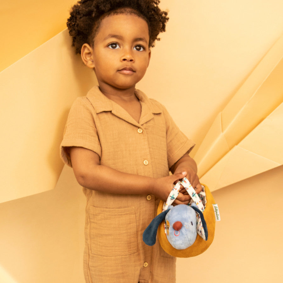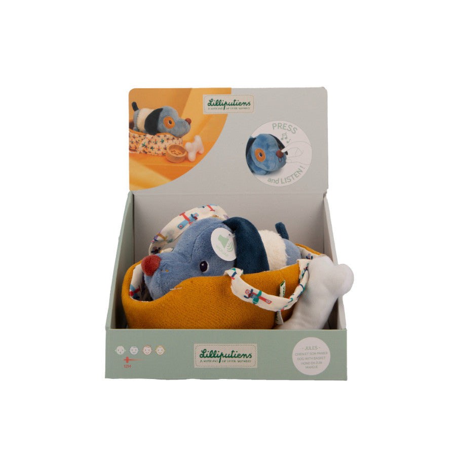 Quel charmant petit chiot dans son panier ! Jules le chien en peluche et ses accessoires feront craquer petits et grands, dès 12 mois. Pour s'amuser et prendre soin de son premier petit chien, votre enfant a tout le nécessaire : un panier réversible avec une face jaune et une face à motifs, un os en tissu, une gamelle en bois avec un imprimé os au fond et une veste amovible. Soit 4 accessoires pour nourrir son chien en peluche, le faire jouer ou dormir tranquillement dans son panier. Avec ses poignées, on peut transporter Jules et ses petites affaires partout où on le souhaite ! En prenant bien soin de lui ou en lui touchant la truffe, il répondra à ses attentions par de joyeux aboiements. Une véritable peluche sonore douce, originale et charmante ! Les petits avions imprimés sur le panier sont assortis à ceux dans les oreilles de Jules. C'est un chien aviateur qui adore l'aventure ! Ses longues oreilles toutes douces sont une extension de plus à cajoler sur cette peluche Lilliputiens. Jules adore enfiler sa veste pour voler dans son avion, mordiller son os préféré et faire la sieste après un bon repas. Avec lui, votre tout-petit développe son imagination et son sens de l'empathie. Doux et joyeux, Jules sera un ami fidèle pour votre enfant. La peluche bleue et ses accessoires sont lavables en machine à 30°, à l'exception des parties en bois. Un copain qui a du chien !