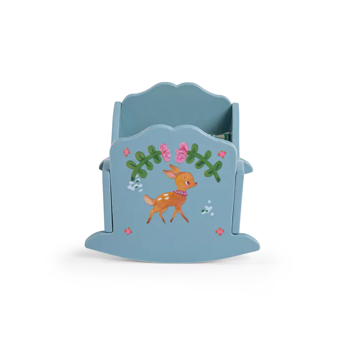 Chuuut.. petit Emile s’endort, bercé tout doucement à la lueur de la lune. Berceau en bois illustré avec son matelas à carreaux. Personnages vendus séparément