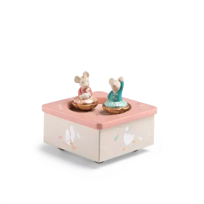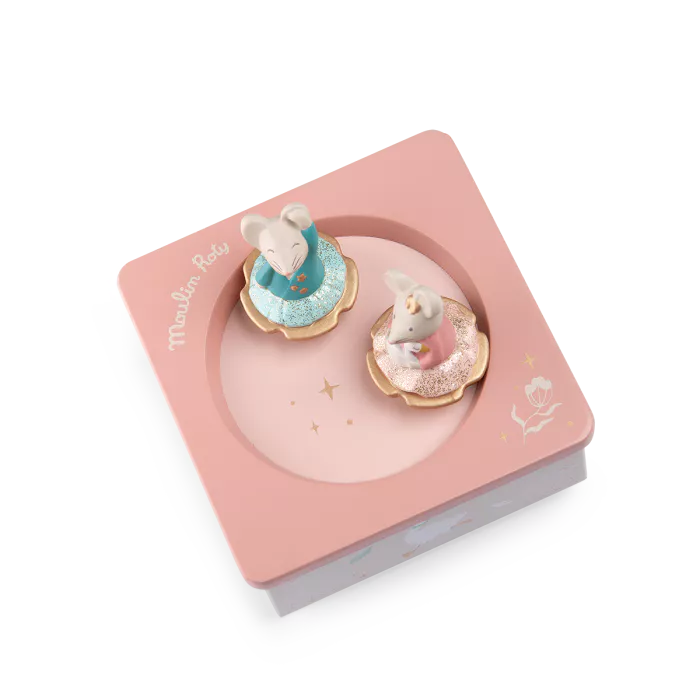 Boite à musique illustrée où 2 petites souris dansent au son d'une douce mélodie pour bercer et endormir bébé. Les plus grands prendront plaisir à actionner eux-mêmes le mécanisme sous la boîte pour voir danser les figurines en résine.
