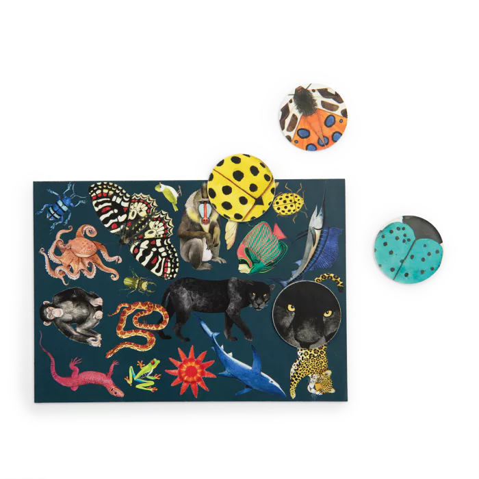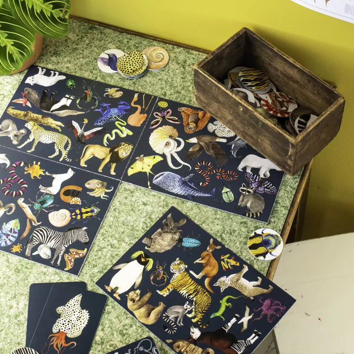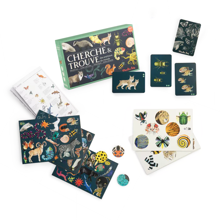Cherche et trouve les animaux du monde le plus vite possible ! Pour pimenter le jeu et gagner plus de points, piochez une carte curiosité. A chaque partie, changez le plateau de jeu en modulant les 9 planches. Un poster avec le nom des animaux inclus.