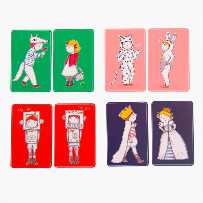 Nos personnages adorés se sont déguisés en duo ! Toutes les cartes forment une paire, sauf la carte Mistigri avec les petits coquins chien et chat. Pour rester positif, le gagnant est cette fois-ci le joueur qui finit la partie avec la carte Mistigri !