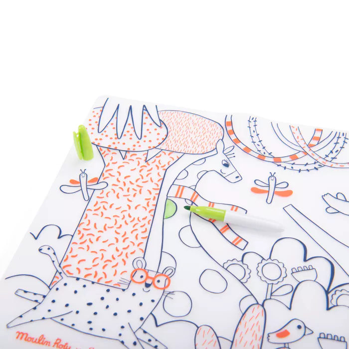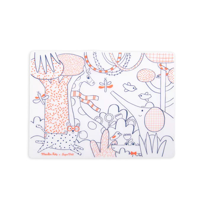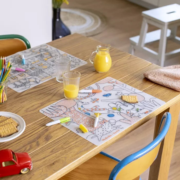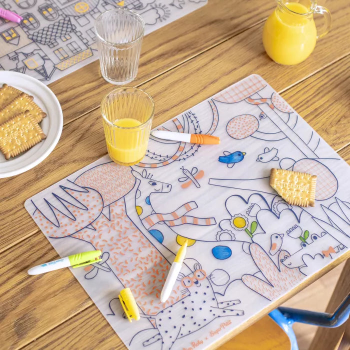 Set de table en silicone à colorier, de la collection les popipop, issu de la collaboration avec Super Petit ! Partagez un moment ludique en famille autour de repas animés et créatifs… Composé d'un set réutilisable à l'infini et 5 feutres effaçables.