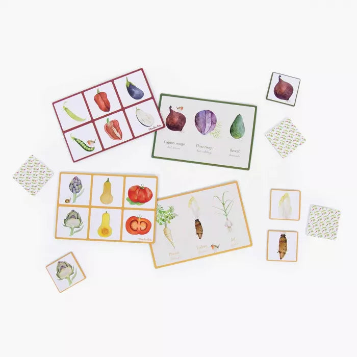 Un jeu 2-en-1 avec 6 planches et 36 cartes illustrées pour jouer au mémo… ou au loto ! Les enfants s'amuseront à reconnaître les légumes dehors ou sous terre, entiers ou coupés en deux, grâce aux fines illustrations à l'aquarelle.