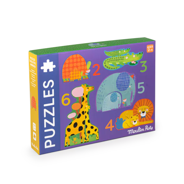 5 puzzles de 2 à 6 pièces, faciles à réaliser et parfaits pour apprendre à compter. Evolutif à partir de 2 ans et jusqu'à 4 ans.