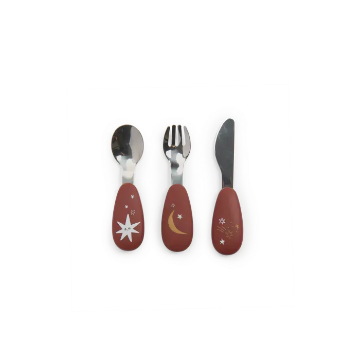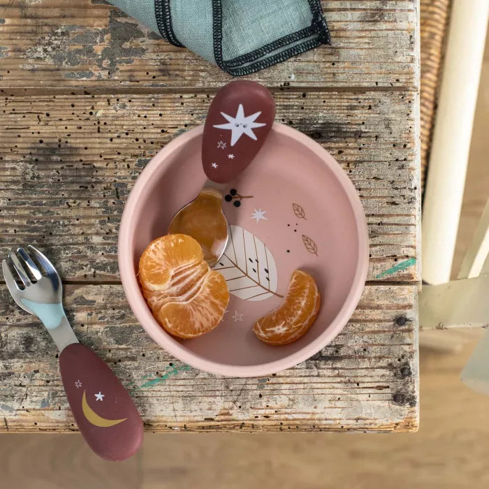Set de 3 couverts en inox et silicone pour une bonne prise main pour manger comme les grands ! Ils sont joliment illustrés aux couleurs de la collection Après la Pluie
