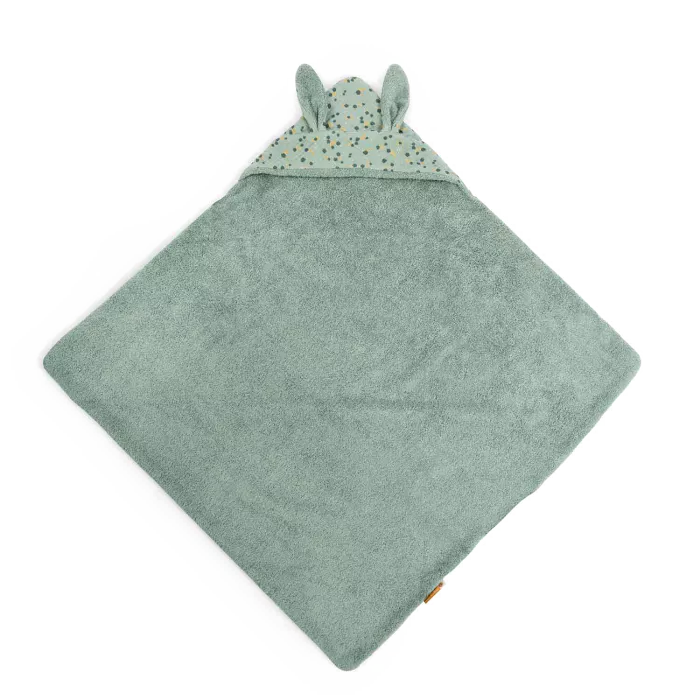 Cape de sortie de bain sauge labelisé OEKO-TEX® STANDARD 100 - CQ1337/1 IFTH, 100% coton en lange et éponge bouclette avec une capuche en tête de lapin pour accueillir chaudement bébé a la sortie du bain. Peut-être brodé au prénom de l'enfant.
