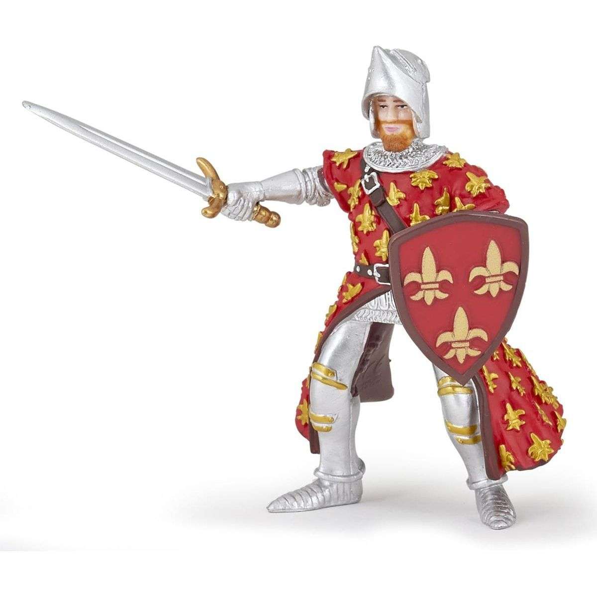 Jolies figurines de Papo représentant le courage et prêts au combat le prince Philip ou les chevaliers en vêtements rouges ou bleus et armure grise avec fourreau et bouclier.
