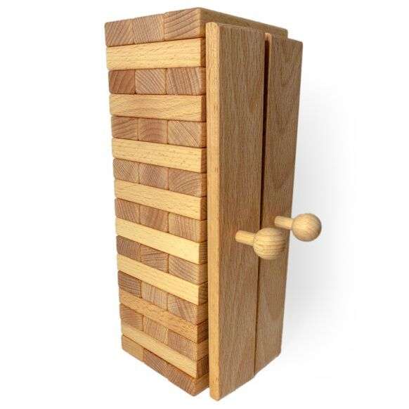 La construction se fait en empilant toujours trois planchettes à plat les unes sur les autres. A l'aide des deux bandes fournies, tous les blocs de construction sont alignés exactement les uns sur les autres. Le défi consiste à retirer les blocs de construction détachés de la structure les uns après les autres, puis à les réassembler au sommet de la même manière que la structure de base. Attention, plus la tour est haute, plus il y a de chances que la construction s'effondre. Le joueur dont la tour s'est tenue en dernier pendant au moins 2 secondes gagne. Tous les blocs de construction sont compatibles avec nos blocs de construction en bois. Les blocs de construction peuvent être facilement transportés et rangés dans le sac à dos en coton fourni. Les 53 pièces sont poncées et traitées à l'huile de noix. Les blocs de construction ne doivent être nettoyés qu'avec un chiffon humide.